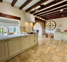 Kitchen - 5.166m x 3.221m (16'11" x 10'6") - Fitted with an extensive range of base and wall units. Work surfaces with single drainer sink unit. Appliances of electric oven with gas hob. Dishwasher. Fridge and Freezer. Feature exposed brick faced wall. Beamed style ceiling. Tiled flooring. Archway into: