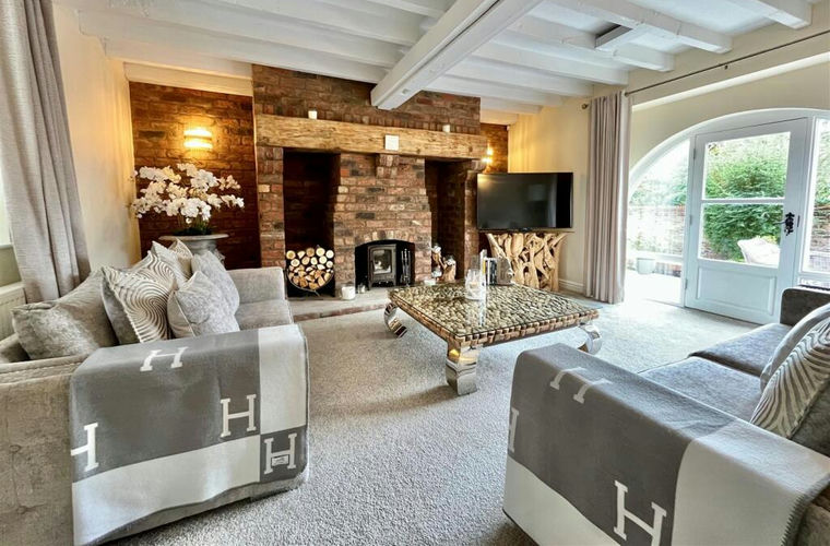 Living Room - 4.505m to back of fireplace x 4.828m (14'9" to bac - Impressive inglenook style fireplace with log burner. Window to the front elevation and door to the rear patio and garden. Beamed style ceiling. Radiator.