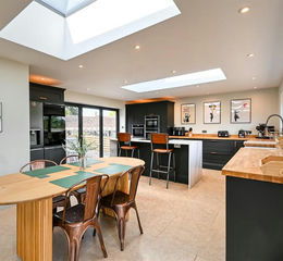 Adjacent to the family area is a striking extension housing a generous 32ft open-plan live-in dining kitchen. Featuring limestone tiling with underfloor heating, two sets of bi-fold doors, and a picture bi-fold window with views from the sink. The kitchen is fitted with a range of base and wall units, solid oak worktops, a granite-topped island with breakfast bar and induction hob, and integrated appliances including an oven, combi steam oven, microwave and a dishwasher. Bifold doors open out onto an elevated terrace overlooking the courtyard.