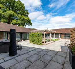 Overview - This stunning barn conversion enjoys full privacy with land, views across adjoining farmland and extremely flexible ground floor living space. Most recently added was a contemporary style 'live in' kitchen with roof lanterns for a light filled space together with bi-doors to enjoy the views and also access to an entertaining area and under floor heating. One of the notable features that sets the barn apart, is the large enclosed courtyard, accessed by the barn on three sides - landscaped and a perfect play area for children or for those who enjoy entertaining. On this theme, a barn within the grounds is equipped with an outdoor kitchen and large covered area.