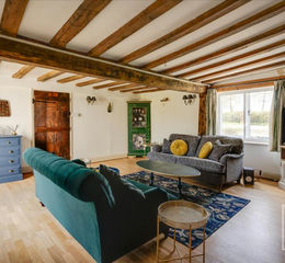 The property’s listing makes mention of the original mullion window at the front of the house, and further historic features include chamfered ceiling joists, studwork and oak doors. A red-brick chimney at the centre has fireplaces with log burners in both the dining room and the sitting room.
