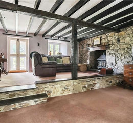This wonderful smallholding offers a generous and flexible layout, ideal for family living or multi-generational use. Upon entering, you’re welcomed into a spacious sitting room, featuring a wood-burning stove set within a traditional fireplace, adding warmth and character to the heart of the home. To the right, a dedicated office/study area provides a quiet and functional space, perfect for remote working or reading. Ahead lies a large formal dining room, ideal for entertaining, which flows directly into a light-filled conservatory, a relaxing spot to enjoy views over the garden and a seamless connection to the outdoor space. To the right of the dining room is the kitchen, designed in a traditional country style and centred around a charming Aga, adding both functionality and rustic charm. The kitchen also includes a walk-in pantry and a separate utility room, offering ample storage and practical working space.