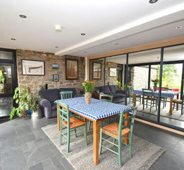 Glazed linked dining room with sliding glazed doors. Built in large Sharpes storage cupboard with full mirrored sliding doors. Exposed stone work and doors to both the Lounge and to the West Wing accommodation: