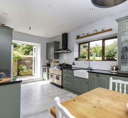 Dining Kitchen - Positioned at the rear of the property, this is a very spacious sociable eating and entertaining space. The room is particularly light and bright with double glazed windows and french double doors. There is an array of fitted units to high and low levels with brick-style splashbacks and feature granite working surfaces. The Belfast-style sink has a mixer tap and a grooved draining area in the adjoining granite worktop and there is space for an American-style freestanding fridge freezer with water supply. The centrepiece of the room is a range-style cooker that has a six-ring gas hob and ovens beneath, along with an Aga Masterchef canopy-style filter hood above. There is an integrated Bosch dishwasher and a microwave. The room can accommodate a good-sized dining suite and has under-floor heating. There is ceiling downlighting and the rear windows enjoy a very pleasant outlook over the garden. Access can be gained to the cellar.
