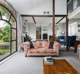 Living Room - This room certainly has the wow factor for a number of reasons and enjoys a full-height ceiling with a galleried landing area. Being the former barn to the farm, a feature has been made of the barn arch which now incorporates double glazed windows overlooking the front garden. There are a series of double glazed rear windows as well as French doors which maximise the natural lighting, which is also enhanced by the full height ceiling and additional windows on the galleried landing. The centrepiece of the room is the floor-to-ceiling fireplace with stonework and a raised hearth with an open fire. There are various wall light points and three radiators.