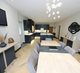 Emulsion walls and ceiling, laminate flooring, fitted wall and base units in Navy with electric hob and oven, oil powered Rayburn, Quartz worktops and splash backs, 2 integrated wine coolers, dishwasher, fridge & freezer, pop-up electric socket with mobile charging power point, 2 radiators, power points, door and window to the front.