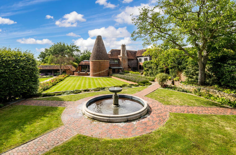 Detail and design are the driving factors behind the contemporary additions including programmable, motion-controlled lighting design by Delmatic, air conditioning to the principal bedroom, full height, powder coated aluminium glazed windows and sliding doors, contemporary designs to bath/shower rooms, a four-person passenger lift and a living roof to the pool/leisure complex. The single roundel of the oast, towers to the kiln above and has a sweeping, easy rising staircase leading from the Portuguese tiles of the ground floor area to the first floor. Approached via a glazed link and furnished in a chic, modern style with units and a large central island by Leicht and integrated appliances by Miele and Quooker, the kitchen/breakfast room has sliding glazing to two sides that perfectly highlight the juxtaposition of the period and contemporary architecture, as one side opens to the courtyard garden adjoining the beauty of the eighteenth-century barn exteriors, whilst the other opens to show the lovely gardens and views over the countryside beyond. Elsewhere on the ground floor is a guest bedroom suite and domestic offices.
