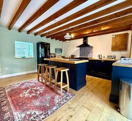 Fully glazed door to front, 2 windows to front, window to rear, exposed beams, exposed stone wall, modern fitted kitchen comprising of 9 base units under a timber worktop, to include integral bin storage, space for a dishwasher, space for a Range Master Stove, tiled splash back, space for a fridge freezer, extractor hood, island unit with bespoke timber worktop/breakfast bar, 2 base units, 2 radiators, oak floor.
