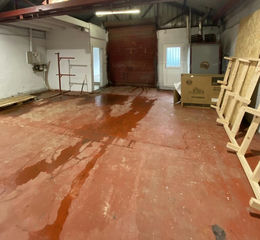 The property is of steel frame construction with a truss roof and has blockwork elevations beneath a pitched profile clad roof incorporating translucent roof lights above a concrete floor. Internally the walls and floors are painted and lighting is provided by spot lights to the warehouse which also benefits from a hot air blower (not tested). The minimum eaves height is approximately 9’7” (2.9m) rising to approximately 16’5” (5m). Vehicular access is via the front roller shutter door and there are two separate pedestrian access doors, one leading directly into the warehouse and the second leading into the office which has plastered and painted walls and a tiled floor. WC facilities are also provided. To the rear of the property is a small storage area and the property benefits from security gills to the windows and doors.