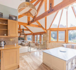 From the Lounge and Reception Room and lounge, a split-level layout leads to the bright Sun Lounge. This open-plan area offers panoramic garden views through cathedral-style double-glazed windows. Exposed oak beams and chandelier lighting subtly blend traditional and contemporary styles. The Sun Lounge also features a convenient kitchenette with a sink, oak roll-top work surfaces and light wood floor and wall-mounted cabinets, ideal for entertaining. An oak stable door provides access to the beautiful wrap-around gardens and the warm toned, stylish tiled flooring from the reception room continues here, kept cosy with underfloor heating.