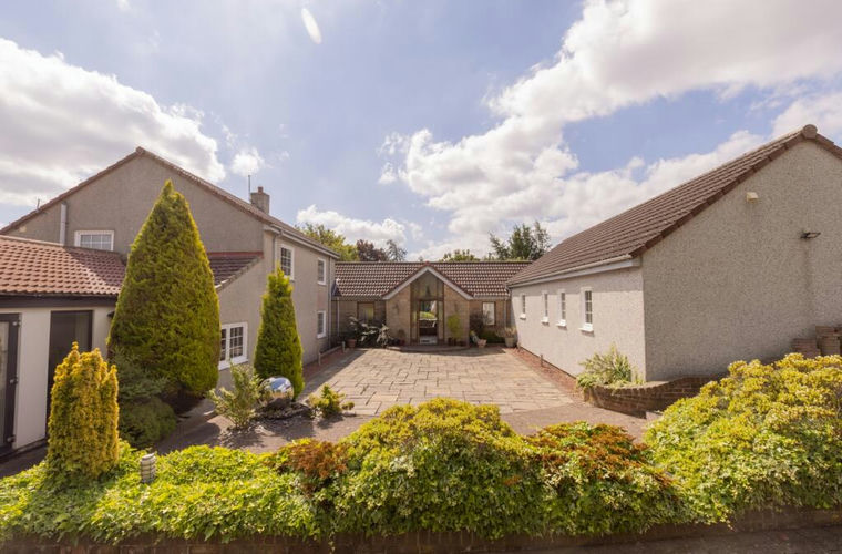 Completing the ground floor is a carpeted double bedroom space with views through the large double glazed window spanning across the front courtyard to the main house