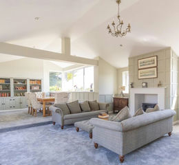 A grand Reception Hall draws you in with vaulted ceilings, chandelier lighting, exposed oak beams and underfloor heating, dressed by stylish warm toned floor tiles. A handy Guest WC is neatly tucked away in the corner and French doors also invite you to the rear terrace. As we are drawn through you feel the space of a vast light-filled Lounge stretching over 10 metres, framed by panoramic windows onto the garden. Whether it's lazy Sunday mornings with the papers or lively get-togethers with friends, this space has the potential to make many memories.