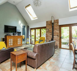 The main house features a large entrance hall with built-in cupboards, leading to an open-plan kitchen with vaulted ceilings and a seamless connection to the living/dining room. This light-filled space is flooded with natural light from skylights, vaulted ceilings, and wooden bifold doors providing easy access to the rear gardens. The property also includes four further bedrooms, a family bathroom, an en-suite shower room off bedroom 1, and an additional reception room used as a snug/office area. Bedroom two is a small double with a mezzanine level perfect for a study or additional storage.