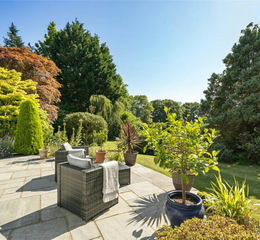 The property is approached over a private driveway onto an area for off-road parking for five cars, and access to the detached double garage equipped with electric roller doors and an EV charging point. The landscaped gardens provide an excellent degree of privacy being enclosed by established hedging. The mature specimen trees and selected shrubs, chosen for all year-round colour, provide a haven of peace and tranquillity. There is, on the west side, an extensive paved terrace for al fresco entertaining and dining and, on the east side, a smaller shaded, covered patio.