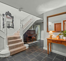 - A grand staircase splits at a half-landing and rises on both sides to the spectacular Living/Dining Room which has a vaulted ceiling with exposed beams and feature cast iron wheel which is part of the original workings of the barn. The room benefits from a number of windows providing an abundance of natural light, in addition to stripped floorboards and a feature fireplace.