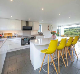 A door at the back of the property leads to a bright and contemporary kitchen with a separate seating area. Floor-to-ceiling windows and bi-fold doors flood the space with natural light and highlight enviable views over the Derwent Valley. The well-appointed kitchen boasts a double oven with an electric hob and fully integrated appliances. A kitchen island incorporates two wine coolers and provides ample space for breakfast bar seating.