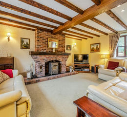The spacious living room is a warm and inviting space featuring a striking brick fireplace with an oak mantle and a Clearview log burner. The room’s dual-aspect windows allow natural light to fill the room, highlighting the exposed beams and adding to the cosy, rustic appeal.