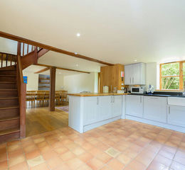 The main entrance leads into a capacious and light-filled open-plan living arrangement, which is beautified by exposed beams. The kitchen features a tiled floor and timeless shaker-style units with granite countertops. The space is equipped with various integrated appliances, including a Bosch ceramic hob with an overhead extractor fan, an AEG dishwasher, an under-counter fridge, an under-counter freezer and a pull-out bin store. There is also a Belfast sink and a wooden-topped breakfast bar, which presents a relaxed dining space.