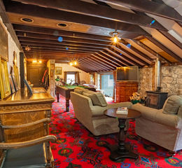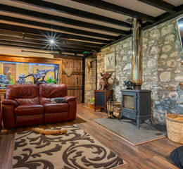 This floor also plays home to an impressive bar and games room, a standout space where rustic stone walls, timber beams and a multi-fuel stove blend seamlessly with modern comforts. This vast room includes a fitted bar, seating areas, space for a pool table and colourful rustic decor that enhances its relaxed, social feel.