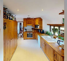 This is an airy and bright triple aspect room with double glazed French doors to the garden, a large double glazed window looking out to the front of the property, open eaves with exposed roof trusses and three pendant light points. A powerful woodburner is mounted on a granite hearth with exposed lined flue, there are three wall light points and underfloor heating. This room has a sitting area and a dining area with a broad opening and steps down to the slightly lower kitchen.