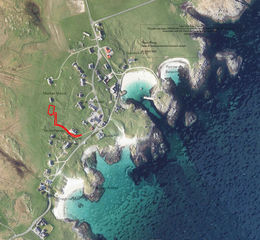 From the pier, proceed along Pier Road for half a mile, turning left at the junction on to the B8065 road. Continue on this road for around half a mile, crossing the cattle grid and pass the Co-op and Tiree Historical Centre on the right hand side. The entrance track to the plot is located on the right hand side after the first house.