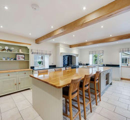 The kitchen forms the heart of this stunning home — a warm and welcoming space centred around a dark blue AGA range cooker. Bespoke handcrafted shaker-style units, a walk-in larder, and a large central island make it the perfect hub for family gatherings and entertaining. There is ample room for an American-style fridge freezer, and the adjoining boot room/utility offers practical space for laundry and storage, with a cloakroom conveniently nearby — ideal after walks through the surrounding countryside.