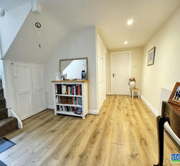 A spacious hallway with wood laminate flooring, radiator, under stairs cupboard, large shelved storage cupboard with plumbing and space for a washing machine.
