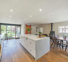 Inside, the heart of the home is the spacious kitchen, featuring an Aga, double Belfast sink set within the island, and a wood burner - ideal for family gatherings or relaxed entertaining. A wall of glass with French doors opens onto a sun terrace, perfect for al fresco dining. A useful utility room offers extra storage and secondary cooking facilities.