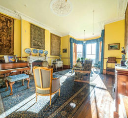 The drawing room has an ornate marble fireplace, coving, dado rail, exposed wood strip flooring, deep bay window, floor to ceiling windows with view over the gardens and grounds.