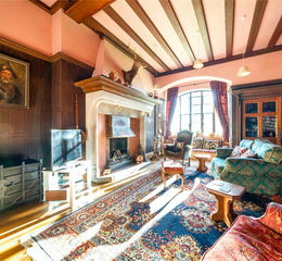 There are numerous period features with interesting fireplaces, exposed floorboards and coving, and of particular note is a superb stained glass window overlooking the first floor landing. Also of note is the unusual and charming turret which is approached via a spiral staircase and from where spectacular views are enjoyed over the countryside.
