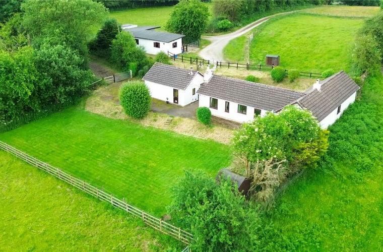 The property spans approximately 5.5 acres and includes a charming cottage bungalow. Inside, you'll find an inviting entrance hall, a spacious sitting room, a dining room, and a generously sized kitchen/breakfast room. The bungalow offers two double bedrooms, double glazing, and oil-fired central heating. Outside, there is off-road parking for several vehicles, a detached garage/workshop with potential for conversion into a self-contained annex (subject to relevant planning regulations), and a separate utility/boiler room. Additionally, the property features stables, a paddock, and extensive informal gardens.