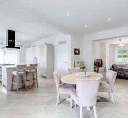 To the front, the driveway offers ample parking, including for a caravan or motorhome, and leads to the yard to the rear and to the main entrance. Step into the hallway and from there to the living room with Karndean flooring. which flows through much of the ground floor, and benefits from wood burning stove. The open plan space continues to the dining area, also with wood burning stove and patio doors to the rear, and into the kitchen comprising a range of wall and base units with central island and quartz work surfaces, range cooker, refrigerator & freezer, dishwasher and microwave.