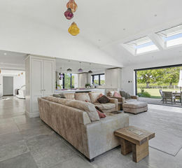 From the moment you step inside, the home's thoughtful design and meticulous craftsmanship are evident. The impressive open-plan layout seamlessly integrates living, dining, and kitchen spaces, ideal for both vibrant gatherings and tranquil family evenings. At its heart lies a bespoke, handcrafted Murray Design kitchen, boasting two generous breakfast islands, extensive larder cupboards, and integrated workstations, exuding contemporary elegance and practicality. Adjacent dining areas comfortably seat up to 20 guests, highlighting the home's fantastic entertaining potential.