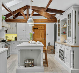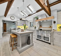 The kitchen is the true heart of Bradley Barn, the everyday entrance for the owners and a space that immediately feels alive. Handmade oak cabinetry painted in soft grey tones pairs with light granite worktops for a look that is both elegant and enduring. A Rangemaster cooker with induction hob, AEG American-style fridge freezer, integrated dishwasher and wine cooler combine design with function. The central island doubles as a breakfast bar, inviting family and friends to gather.