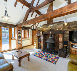 - Spacious sitting room with a large brick fireplace, a heavy wooden beam, a wood-burning stove, and an A-frame wooden beam, adding charm and warmth.