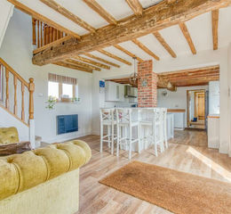 Kitchen / Diner - 8.4 x 4.3 (27'6" x 14'1") - With wood effect engineered flooring, neutral decor, traditional open beamed ceilings, front aspect double glazed window, front aspect double glazed French doors to the garden, a range of contemporary fitted wall and floor units to white with wood effect roll edge worktop, space for fridge/freezer, inset porcelain sink with chrome monobloc tap, space for range cooker with extractor hood over, fitted island unit with base cupboards, breakfast bar and stone worktop, with inset wine chiller. Two rear aspect double glazed windows, two electric panel heaters, first staircase to first floor and under-stairs storage.