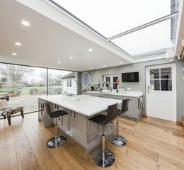 Kitchen / Breakfast Room - 17'5" x 13'9" - This stunning refitted and extended kitchen/breakfast room is a bright and welcoming space, featuring a large central island with a white stone countertop and several stools for casual dining or entertaining. The room boasts a stylish blend of traditional and contemporary elements, with grey cabinetry, built-in ovens, and a wine cooler. Expansive floor to ceiling glazed doors open out onto the patio, flooding the room with natural light and providing seamless access to the garden. Wooden flooring and a partially glazed roof section add warmth and an airy feel, making this a perfect heart of the home. Connected to the dining room.