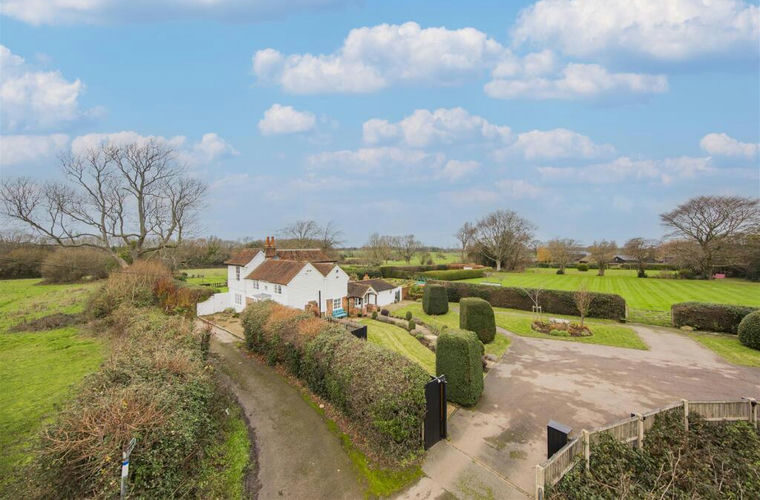 Front Exterior - The front exterior of the property of this traditional white-painted house with brickwork on the lower section. It is set back from the road with a large driveway via an electric gated entrance and is bordered by hedges and mature trees, giving privacy and a charming country feel.