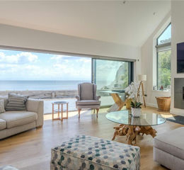 The accommodation is arranged over two levels, with a seamless blend of engineered oak and porcelain tiled flooring adding to the sense of refinement. At the heart of the home, the spacious open-plan kitchen and living area is equipped with high-quality electrical appliances, quartz worktops, and bespoke base cupboards. A striking curved picture window and bi-fold sliding doors lead out to the rear terrace, framing the spectacular coastal views. Additional ground floor amenities include a utility and laundry room, a second utility space with a separate shower and WC, and a splendid sitting room to the eastern wing, where large picture windows and a glass-fronted Stovax fireplace create a warm and inviting atmosphere.