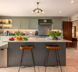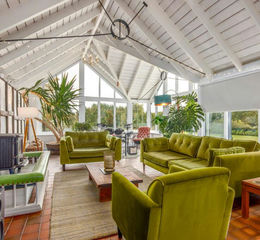 Inside, the property features generous reception rooms, a vast open-plan kitchen/dining space, bar and garden room, ideal for entertaining. Outbuildings include a two-storey studio, home office pod and barn, offering scope for multi-generational living, creative use or future development (STPP).
