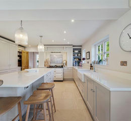 A feature of particular note is the stunning open plan living dining kitchen. The shaker style kitchen has a large central island with quartz worksurfaces, Belfast sink and electric AGA, the room benefits from beautiful limestone flagged floor with underfloor heating. The side door leads to a fitted boot room, downstairs WC and cloakroom.