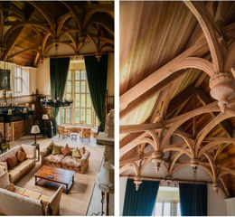 The Great Hall is the true showpiece of the house, with a soaring double-height green oak hammer beam ceiling, hand-carved frieze, and a floor-to-ceiling bay window drawing in spectacular natural light. A minstrel gallery overlooks the room, and a billiards table tucked beneath it quietly emphasises the grandeur of the space. The adjacent cinema room, connected to a bespoke sound system installed by Meridian, features acoustic absorbers and air conditioning—just one example of how seamlessly technology has been integrated throughout.