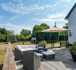 Approached via three separate driveways, the home enjoys a private and secluded setting, enhanced by beautifully maintained wraparound gardens. The grounds feature sweeping lawns, mature trees including plum, silver birch and oak, a charming stream along the rear boundary, and open views over neighbouring horse fields. A large timber decked seating area provides an idyllic elevated spot for enjoying the scenery, while the addition of external power sockets and an EV charging point ensures modern practicality.