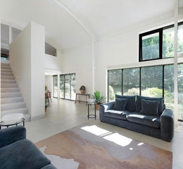 Within the tailored architectural perspectives and floor to ceiling windows throughout, the spacious airy accommodation in the east wing is accessed via a pooled quadrangle and comprises: a wide entrance hall and bespoke fitted cupboards, leading to an expansive open-plan ‘U’-shaped living area with underground heating. This luxurious space displays an elegant sitting room with expansive vaulted ceiling, large levels of natural light and Heta Scanline clean-burning stove. The large dining area sits between the sitting room and kitchen, with wide floor to ceiling double glass doors to the morning garden terrace to the east.