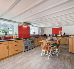 The large, L-shaped, open-plan lounge has a fireplace with cloam oven and a contemporary multi-fuel burner set on tiled hearth, windows to the rear and opens into the kitchen.