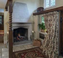 stone and woodwork, feature fireplaces and leaded windows.
