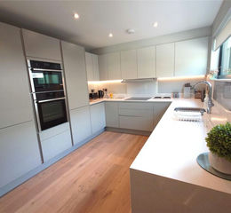 The principal living area is open plan and offers a large seating area with bi-fold doors opening to the front decking. There is room for a family dining table adjacent to the very well specified kitchen. A range of German, handleless cabinets house a Neff oven and combi-oven, an integral full height, fridge-freezer and built in dishwasher. A Neff induction hob sits within the Silestone worktop.
