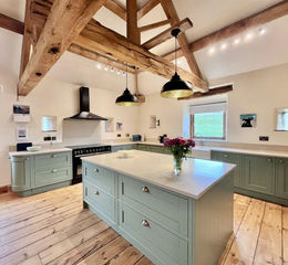 Dining Kitchen - Timber framed double glazed windows, fitted base units with a granite worktop over, space for a Rangemaster cooker with a matching extractor fan over, ceramic double sink with a mixer tap over, integral NEFF dishwasher, kitchen island with a granite worktop and pop-up power points with USB and USC charging points, exposed stone feature walls, exposed timber ceiling beams, and wooden flooring with underfloor heating.