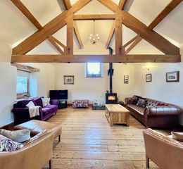 Living Room - 5.49m x 5.59m (18 x 18'4) - Three double glazed windows, log burner, exposed stone feature walls, exposed timber ceiling beams, and wooden flooring with underfloor heating.