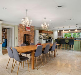 The accommodation is arranged as follows: a grand entrance hall with a superb bespoke marble staircase; a spacious Chiselwood kitchen/breakfast room fitted with high-quality wall and base units, a central island, marble worktops, integrated appliances, and an Aga. This inviting space serves as the hub of the home, featuring a fireplace with wood burning stove, windows on three sides, and double doors opening onto the garden. The kitchen also leads into an impressive oak-framed garden room with a vaulted ceiling, wood burning stove and further doors to the garden.